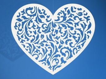 Bílá papírová dekorace ve tvaru srdíčka s vystříhaným vzorem. Ideální pro výzdobu svatební hostiny nebo zahradní párty.