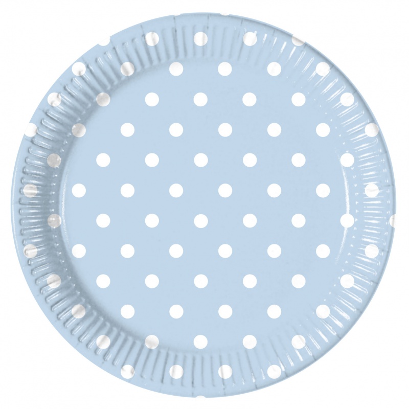 Papírové talíře ve světle modré barvě s puntíky, vhodné na piknik, oslavu narozenin nebo párty.