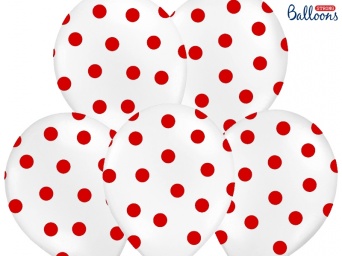 Bílé balonky s puntíky červené barvy, možné plnit jak vzduchem, tak héliem. Velmi pevné.